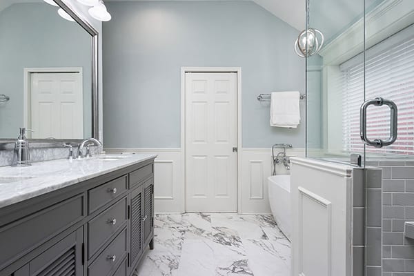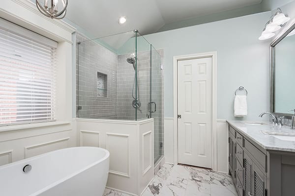 With such a large existing window, we framed and trimmed out this window with a beautiful white crown and trim to flow with the new wainscoting surround. A Carrara look marble tile floor and new gray double sink vanity tied in with the color scheme perfectly. New lighting and a stunning small chandelier above the modern stand along tub, created the elegant design the homeowners desired.